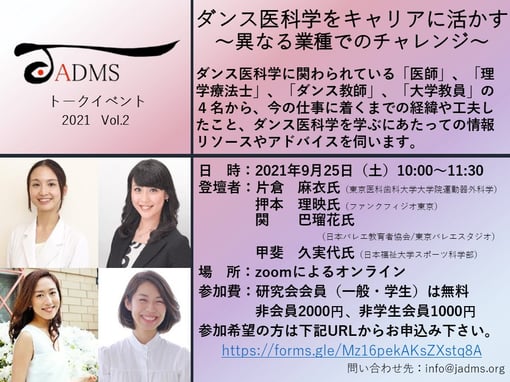参加費:日本ダンス医科学研究会会員無料、非会員(一般)2000円、非会員(学生)1000円