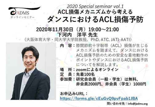 参加費:日本ダンス医科学研究会会員無料、非会員(一般)2000円、非会員(学生)1000円